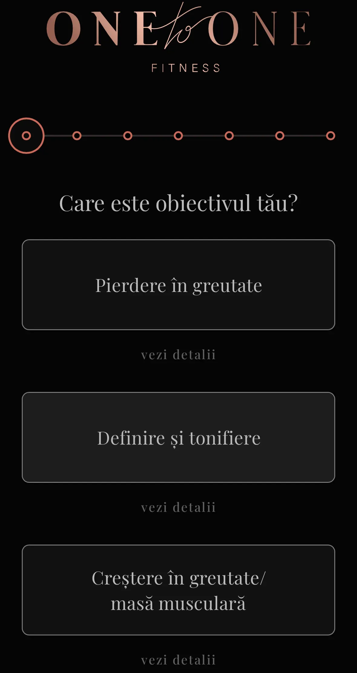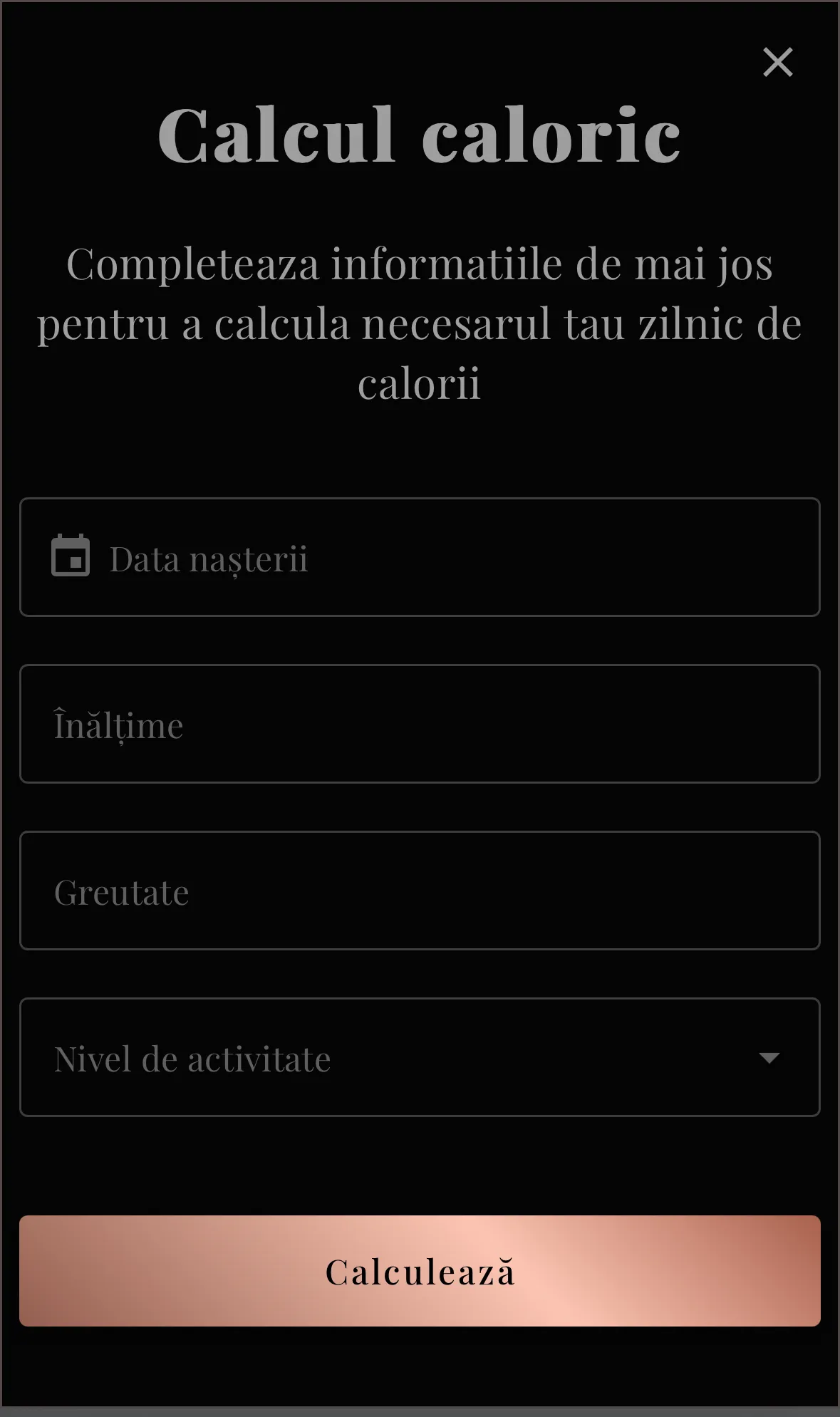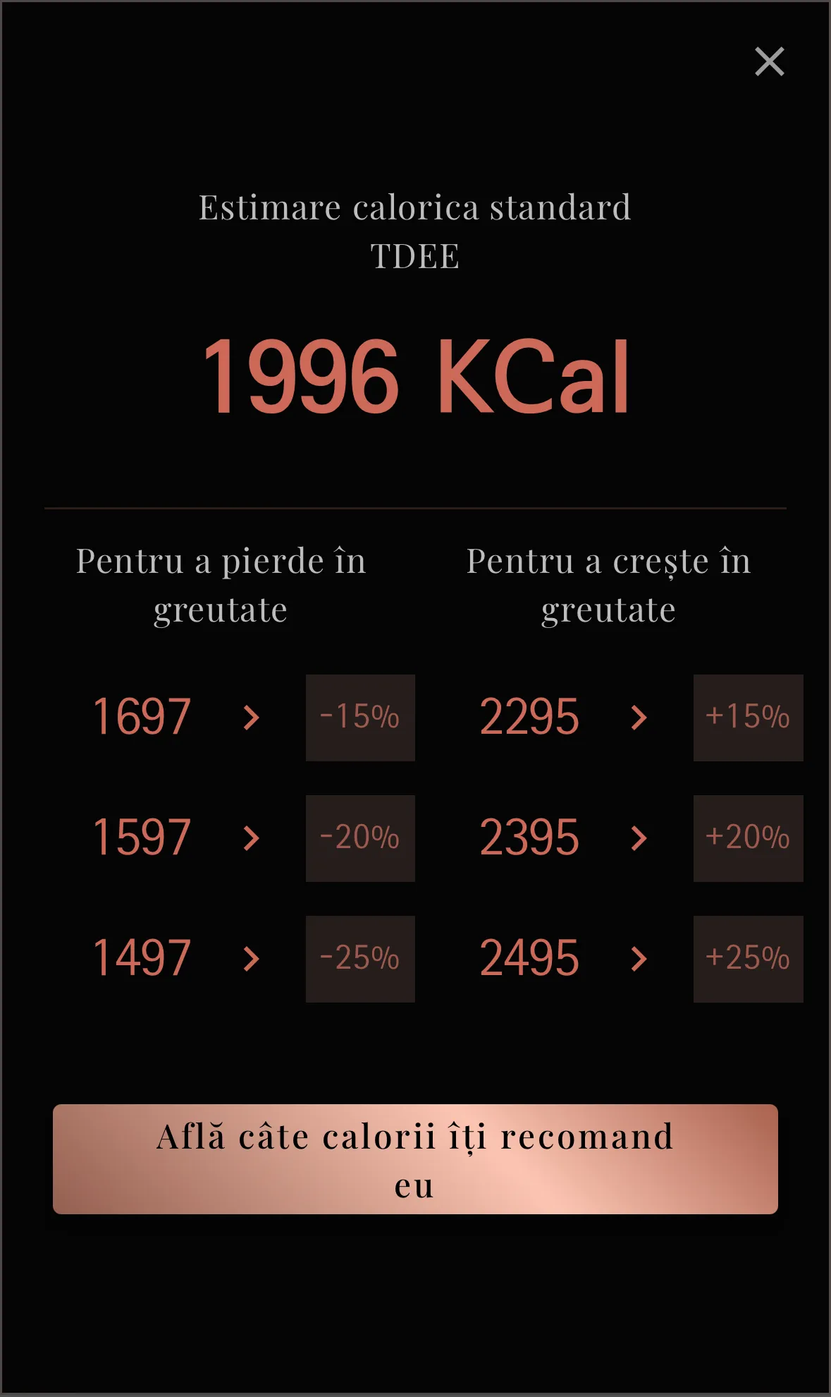 Următorul pas este să îți selectezi obiectivul: dorești să slăbești, să crești în greutate sau să îți menții forma fizică? În funcție de alegerea ta, vom calcula numărul recomandat de calorii necesare pentru a-ți atinge obiectivul, fie că este vorba de pierderea în greutate, creșterea masei musculare sau menținerea tonusului.
