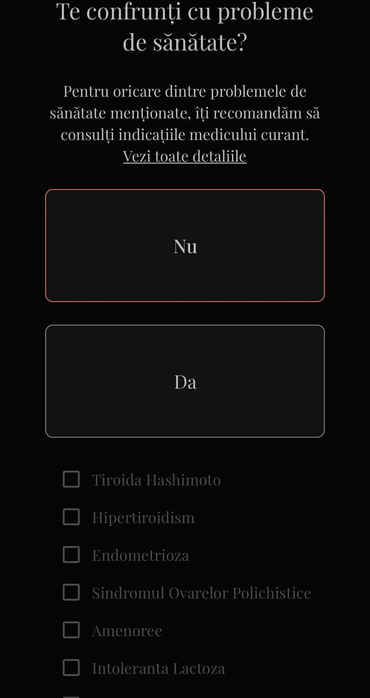 În acest pas, te rugăm să specifici dacă ai probleme de sănătate. Aceste informații nu vor fi salvate, ci vor fi folosite exclusiv pentru a adapta planul alimentar la nevoile tale, în cazul în care există afecțiuni care necesită o atenție specială.