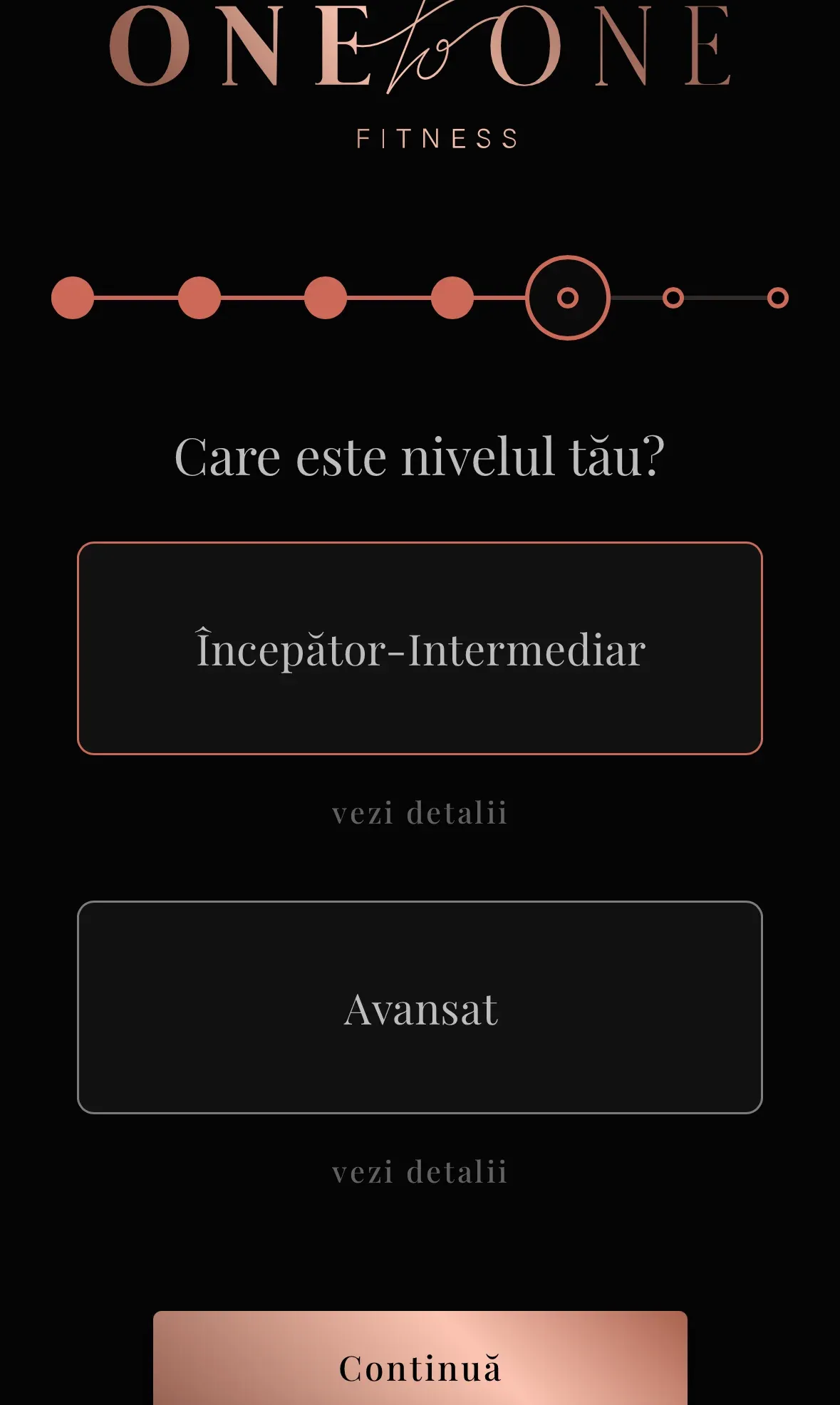 În acest pas, trebuie să selectezi nivelul tău de experiență în antrenamente. Alegerea făcută va influența planul alimentar personalizat care îți va fi oferit. Te încurajăm să alegi cu obiectivitate, deoarece aceasta poate avea un impact direct asupra eficienței dietei tale.