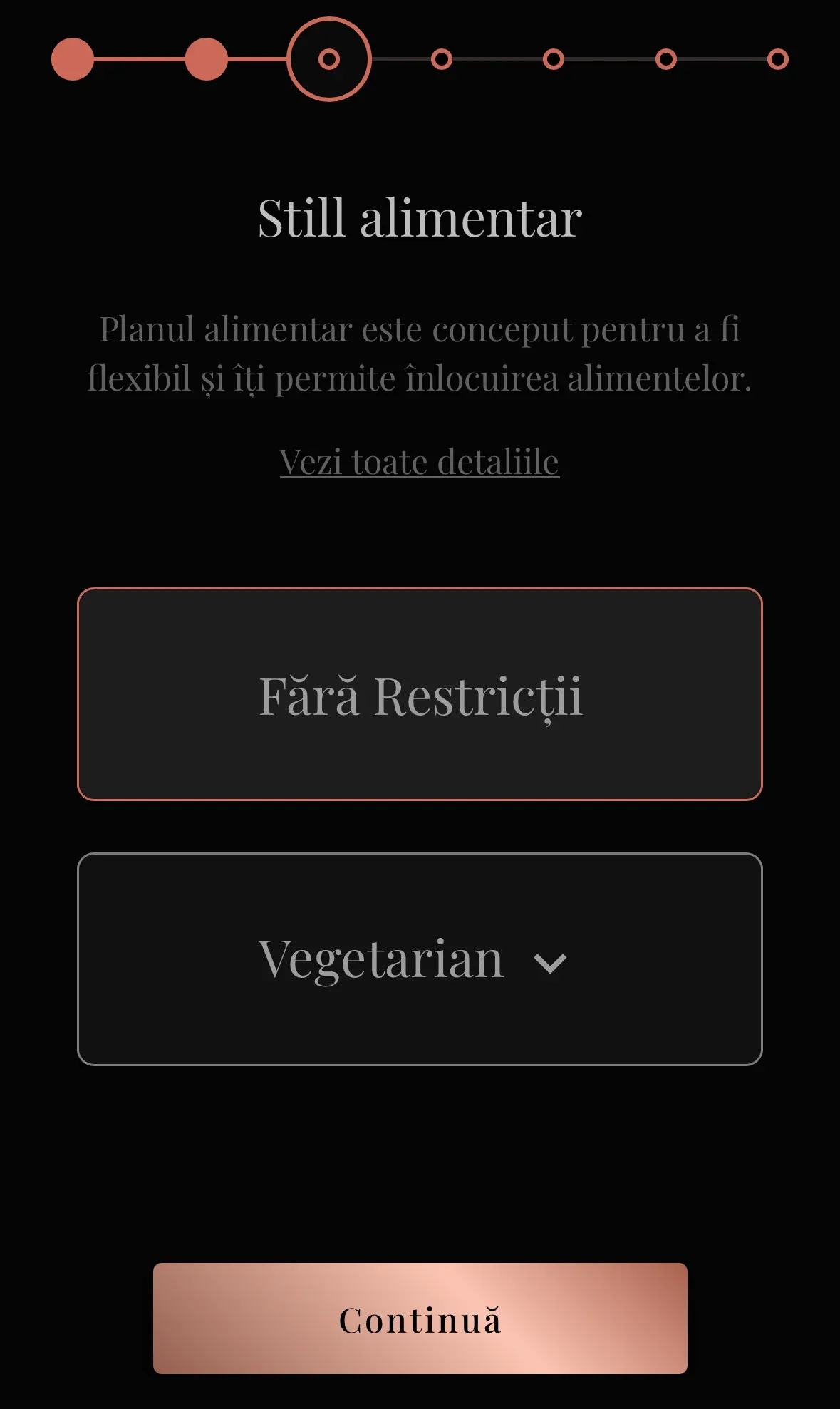 Următorul pas este să selectezi preferințele tale alimentare: fără restricții sau vegetarian. Dacă alegi opțiunea vegetariană, aceasta este împărțită în trei tipuri: vegan 100%, ovo-lacto și ovo-lacto-peste.